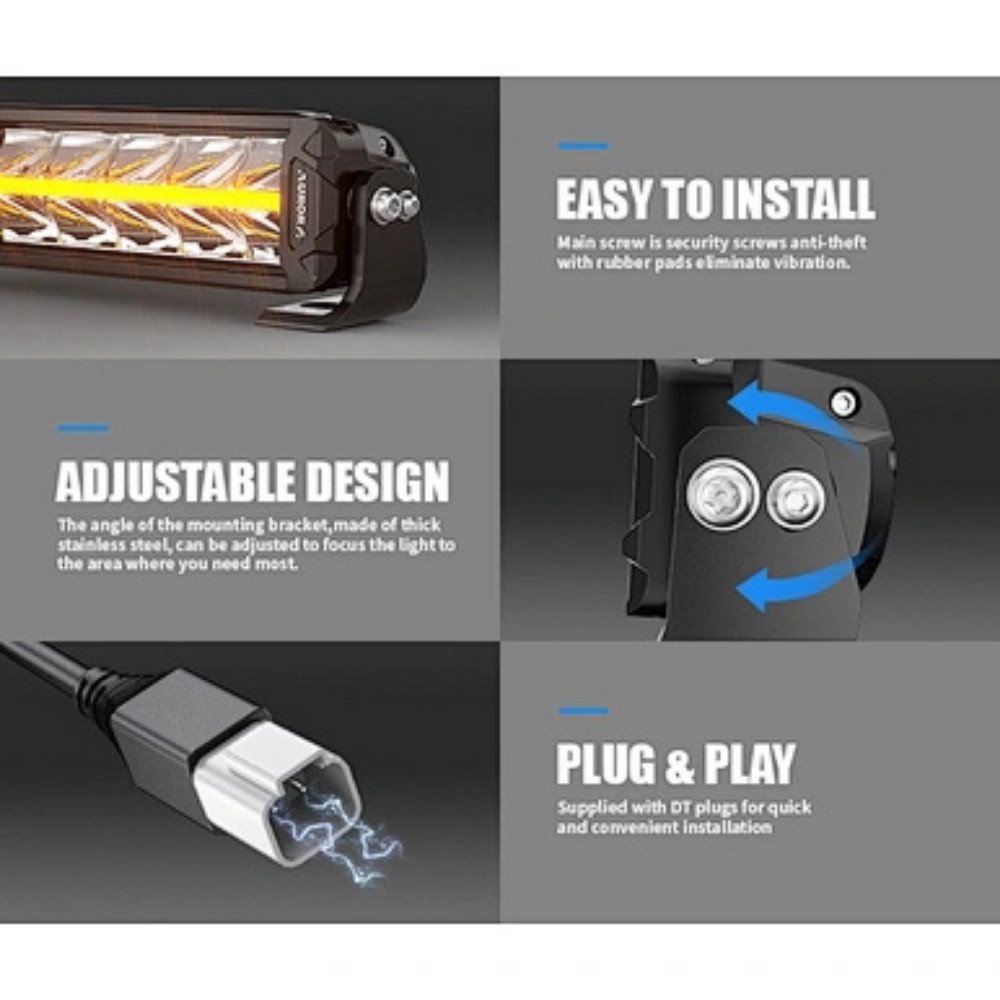 The dual row combo beam provides the perfect balance of long-distance projection and wide peripheral spread, helping you spot hazards early while maintaining excellent side visibility. Integrated amber and white backlights give you added versatility—amber for improved visibility in dust, fog and rain, and white for a clean DRL or accent-light look when the main beam isn’t required.