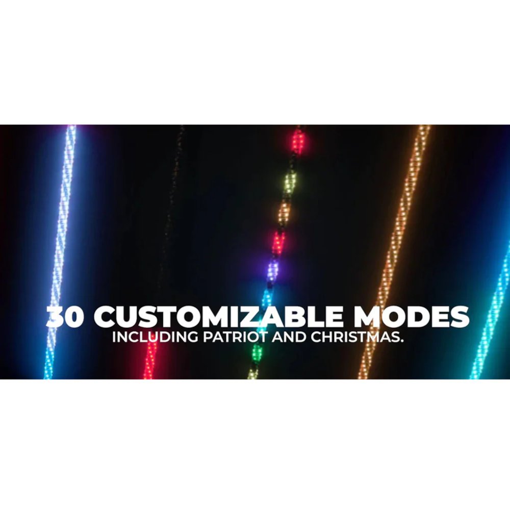 - LED Light show: 360-degree show with unlimited solid or flashing colours, over 30 preset modes including chasing, cascading, patriot, Christmas, music, and street legal modes. Create an unlimited number of modes and colours with our custom mode tool.
