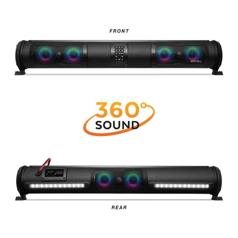 The SEDS33 SoundExtreme Elite 500W 360 SOUND IP66 Waterproof Dustproof Powersports Soundbar integrated EcoCast and LEDCast lighting control with smartphone SoundExtreme App.