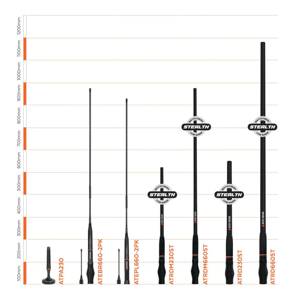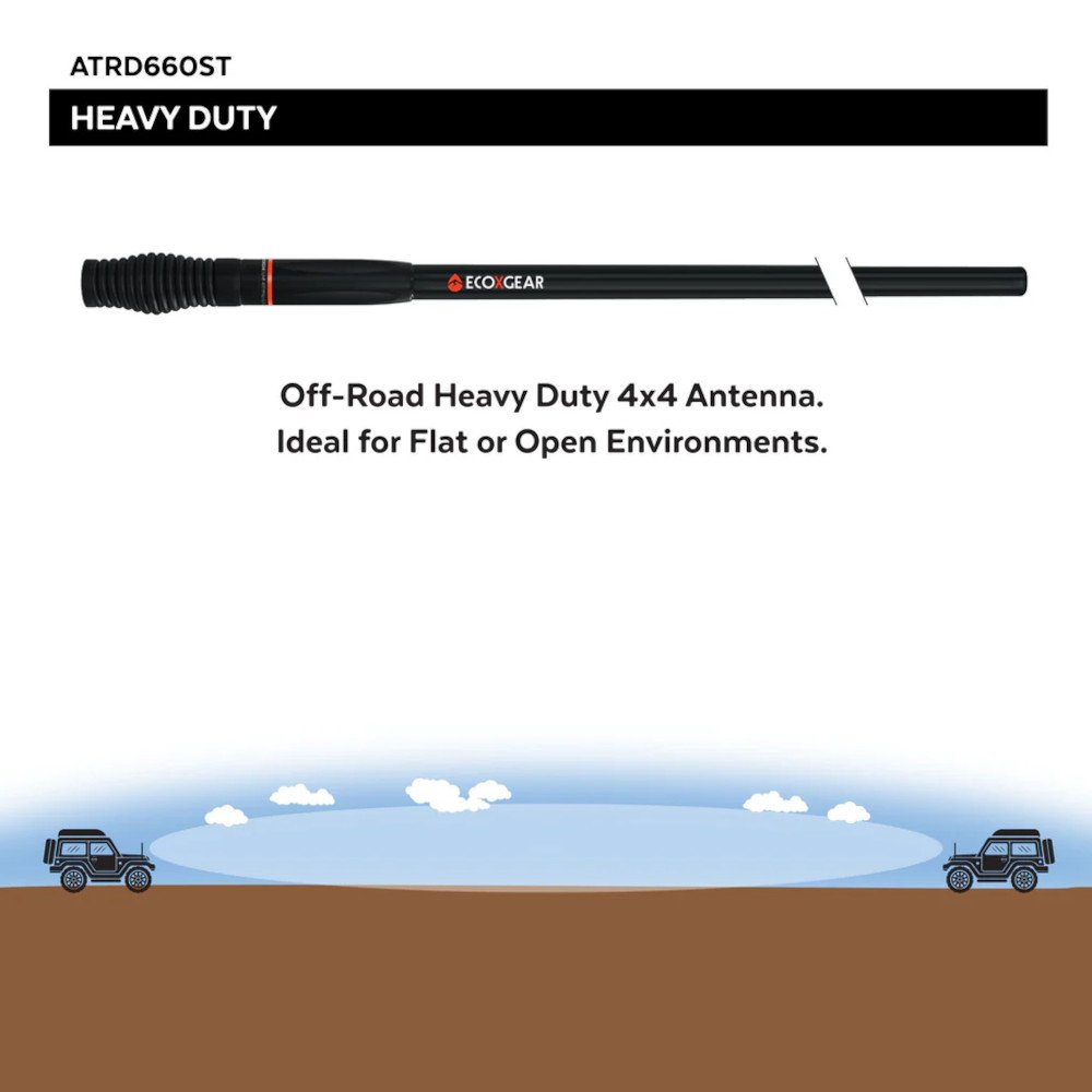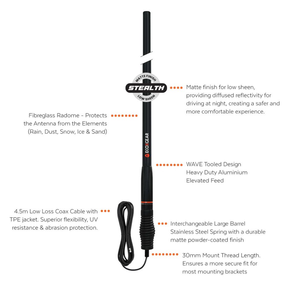 A rugged heavy-duty antenna best suited for 4WD enthusiasts and off-road touring. Stealth Matte finish for low sheen, providing diffused reflectivity for driving at night, creating a safer and more comfortable experience. Ideal for communication across long flat and open environments.