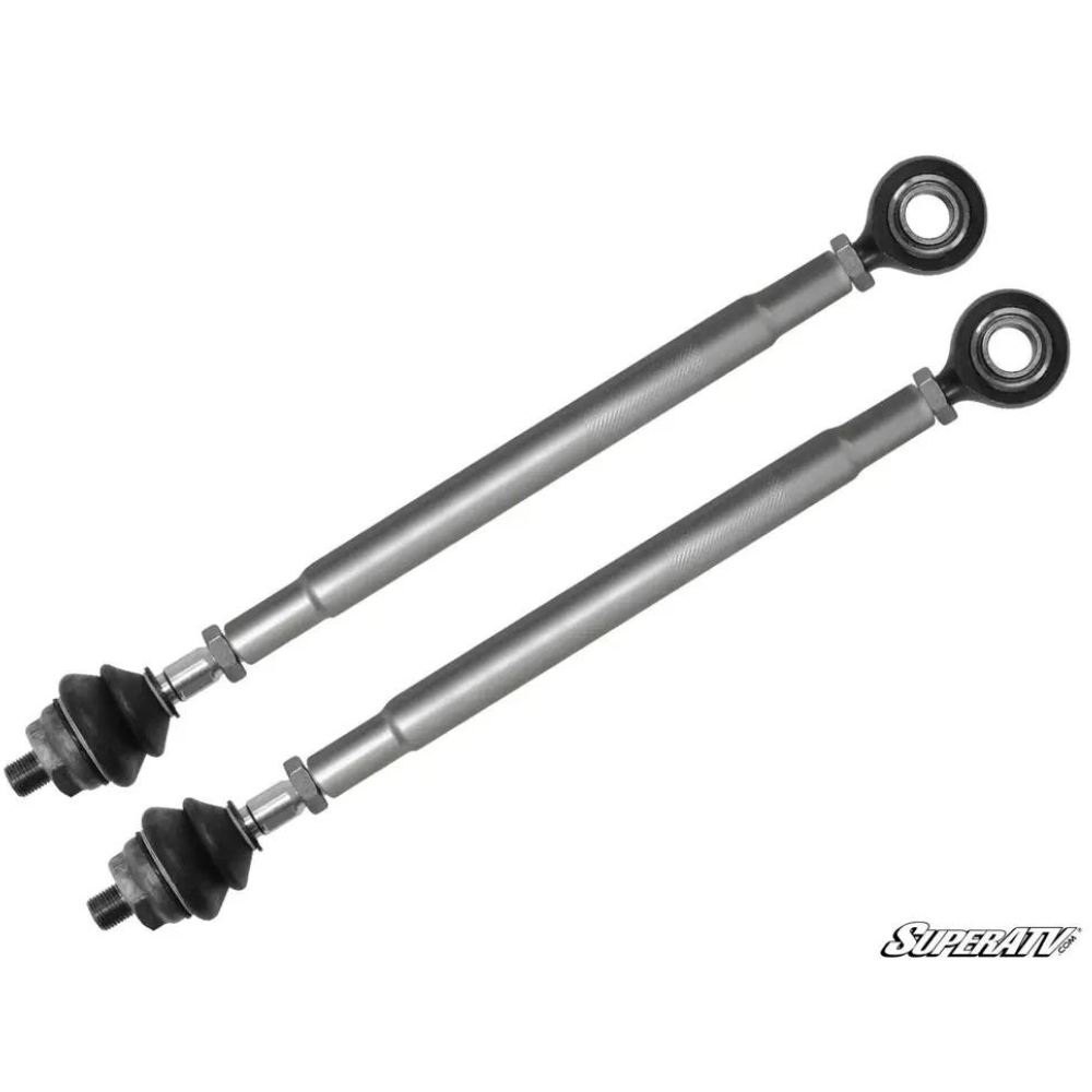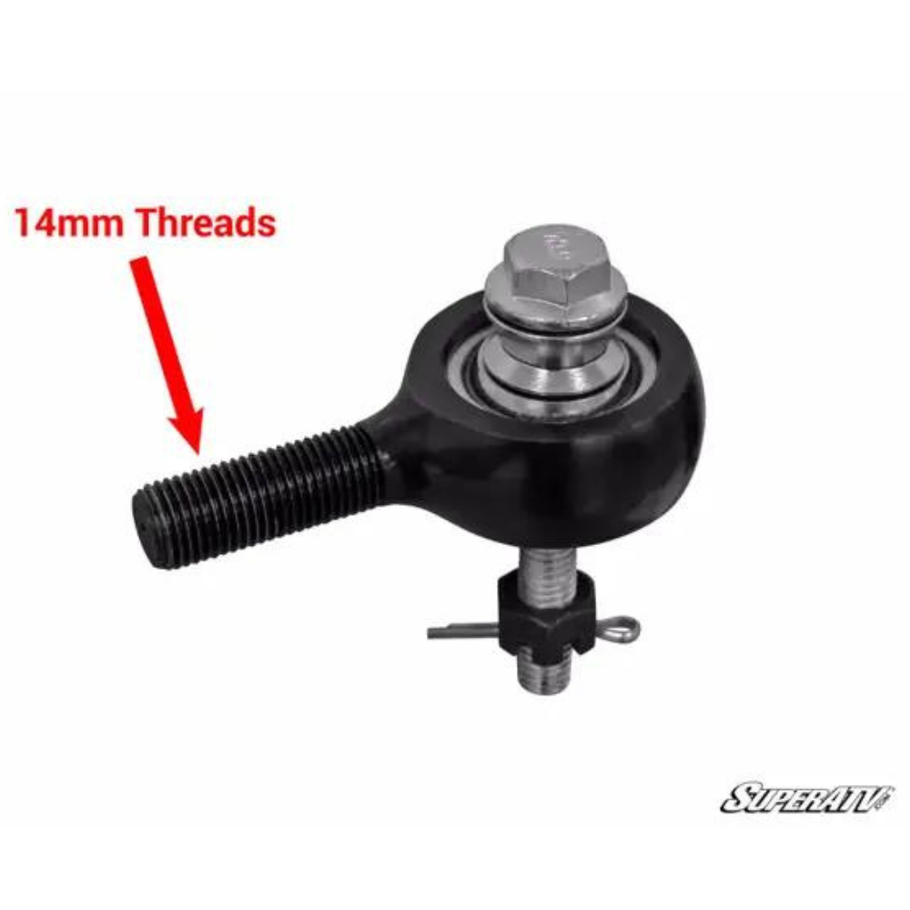 Increased tie rod bearing size for increased strength Stock length replacement Heavy-duty tie rod ends Swaged tie rods for maximum strength Complete tie rod assembly Simple design for a quick, no-hassle install Adjustable on the fly SuperATV Tie Rod Ends 4130 Chromoly Heavy-duty design Precision blend of materials and heat treatment M14x1.5 threads Only works with SuperATV Heavy-Duty Tie Rods