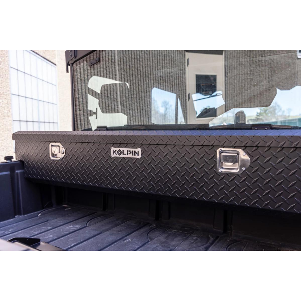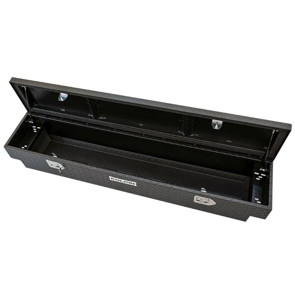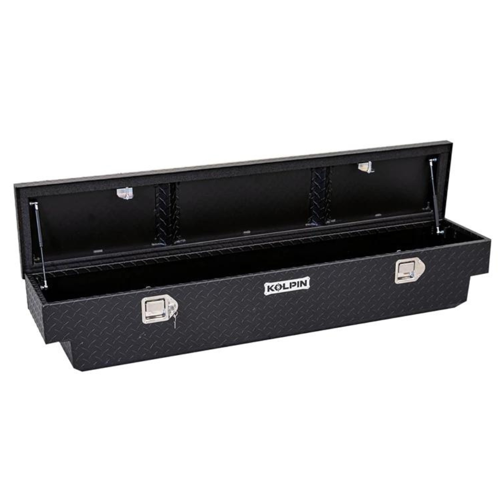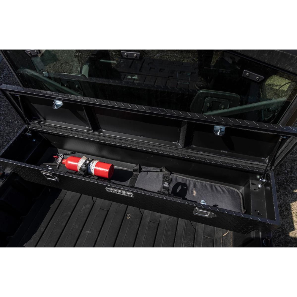 Featuring lockable stainless steel latches, this weatherproof storage box is accessible from both the driver and passenger sides.