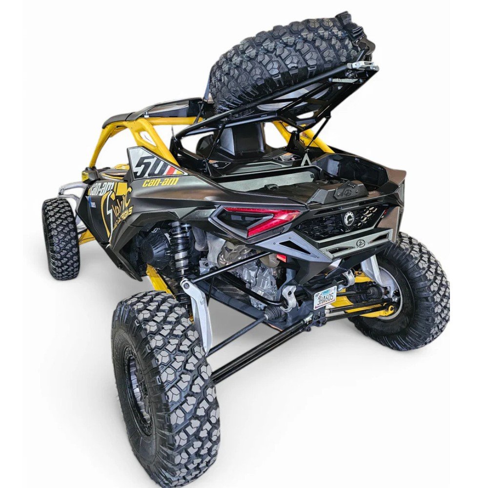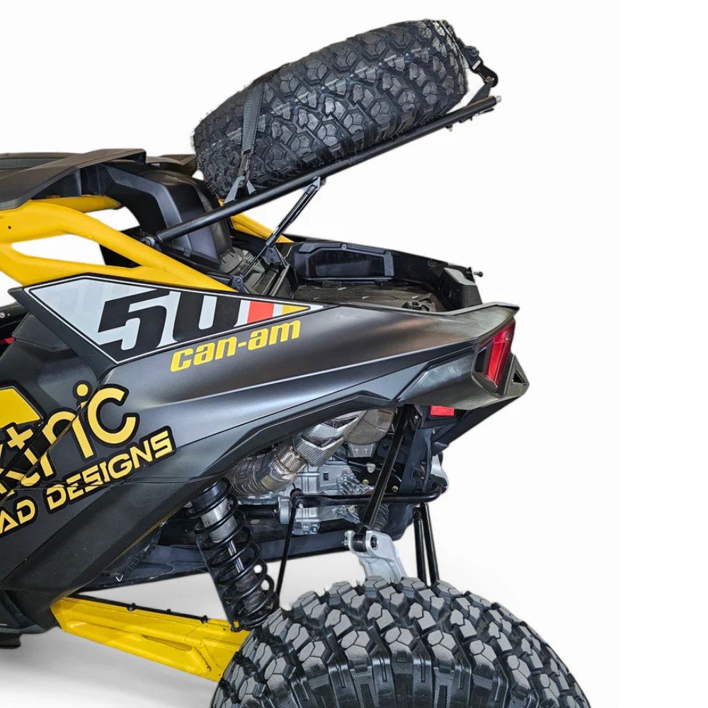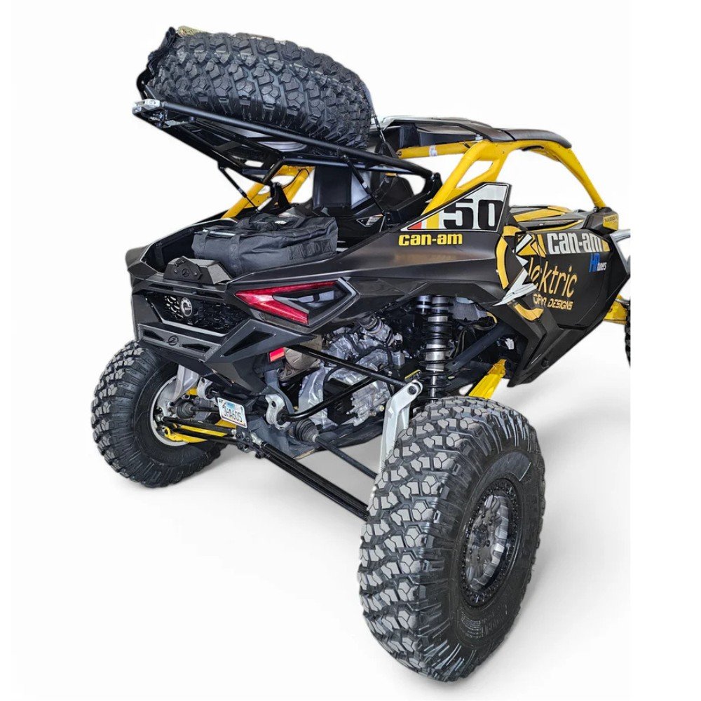 Carry a spare wheel with confidence using the Elektric Offroad Volt Tyre Rack with Gas Struts for Can-Am Maverick R (2024+). Designed specifically for the Maverick R platform, this heavy-duty tyre rack provides a secure and convenient mounting solution for a spare tyre while maintaining easy access to the rear cargo area.